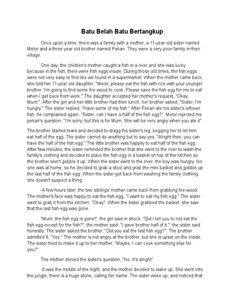 Batu belah batu bertangkup is one of the folk stories originating from riau province. Batu belah batu bertangkup is the story of a mother who lives with her son and daughter. The mother loves to eat the eggs of the ikan tembakul ( . Nurezzati today i want to tell you Batu belah batu bertangkup book. You can publish your book online for free in a few minutes!